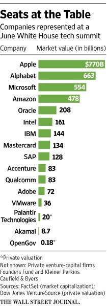 “OpenGov’s Mr. Bookman was the only chief executive of a small firm among the 18 tech leaders to get a seat at the table with the president. At least one other startup CEO had a second-row seat. OpenGov’s valuation was estimated at $180 million after an October 2015 funding round, according to Dow Jones VentureSource, while the average market capitalization of the 14 publicly traded companies represented at the table including Amazon.com Inc.,Apple Inc., Microsoft Corp. and Alphabet Inc. —is about $250 billion, according to FactSet.”