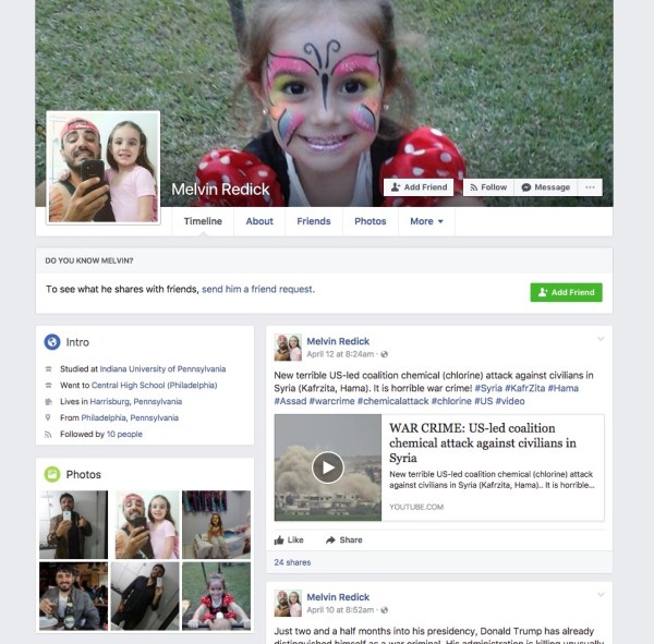The Redick profile lists Central High School in Philadelphia and Indiana University of Pennsylvania as his alma maters; neither has any record of his attendance. In one of his photos, this purported Pennsylvania lifer is sitting in a restaurant in Brazil — and in another, his daughter’s bedroom appears to have a Brazilian-style electrical outlet. His posts were never personal, just news articles reflecting a pro-Russian worldview.