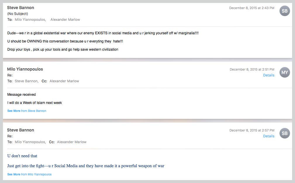 “And the cache of emails — some of the most newsworthy of which BuzzFeed News is now making public — expose the extent to which this machine depended on Yiannopoulos, who channeled voices both inside and outside the establishment into a clear narrative about the threat liberal discourse posed to America.”