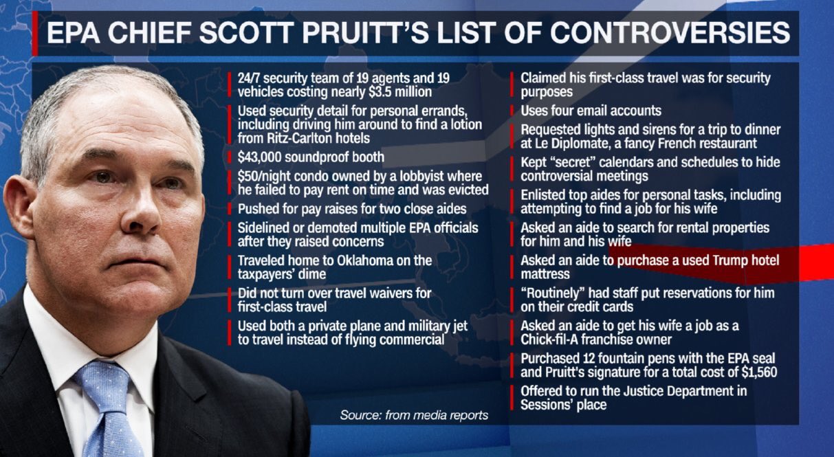 According to a June 25, 2018 VOX report by Umair Irfan, “Multiple institutions — including the Government Accountability Office, the EPA’s inspector general, the House Oversight Committee, and the White House — are investigating Pruitt’s indiscretions, including his first class luxury travel, a sweetheart housing deal with a lobbyist, and his use of a loophole to get raises for two close aides.”