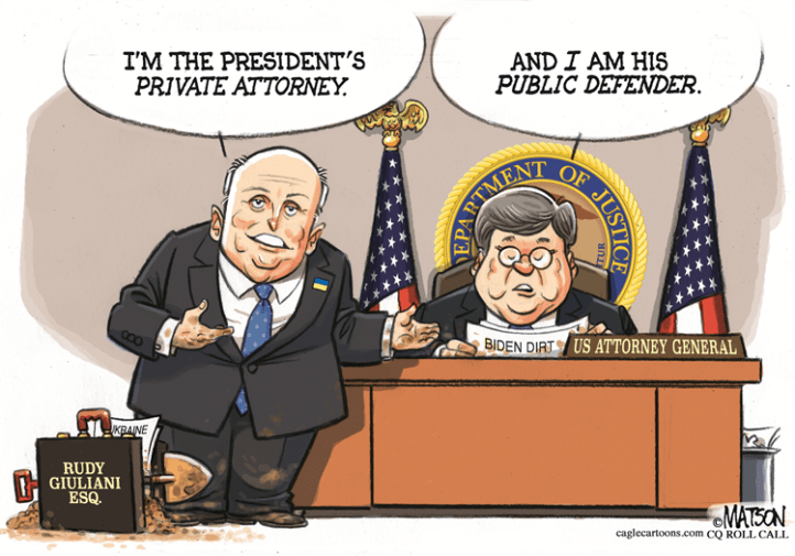 In the current Trump-Ukraine saga, President Trump has referred frequently to his point men, AG Bill Barr and Rudy Giuliani, as representing his interests. For example, during President Trump’s 7/25 phone conversation with Ukraine’s president where he could be heard requesting favors to help him win his reelection prospects in 2020. Both are heavily involved with this Trump-Ukraine scandal which was exposed in a 8/12 whistle-blower’s complaint, deemed to be credible and of an urgent concern by the (ICIG) Intelligence Community’s Inspector General Michael Atkinson, and which the AG Barr had attempted to quash.