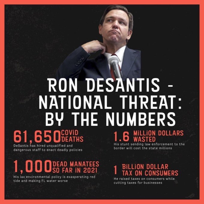 How Governor Desantis has led the State of Florida to where it has ended up being 3rd in USA for COVID deaths; how he has retaliated against the Tampa Bay Rays baseball team for posting tweets calling for gun safety laws following the school shooting in Uvalde, Texas; how he has banned even math textbooks in classrooms;” how during a public appearance, he had admonished High School students located behind him on stage as props for wearing masks; how he had ordered Venezuelan asylum seekers in Texas to be relocated by air to Martha’s Vineyard; how he had directed police to round up folks who’d allegedly voted illegally, but the cases were all dismissed by a Miami judge; how he had personally redrawn Florida’s redistricting maps in 2022 to be extremely favorable to Republican Party candidates and how his redistricting map wiped away half of the state’s Black-dominated congressional districts, dramatically curtailing Black voting power in what used to be considered, a “swing state.”