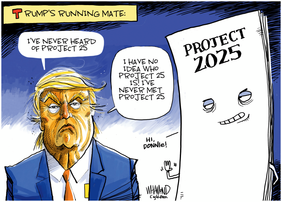 “Vance’s way of operating “pushes beyond precedent, tradition, and norms,” and according to the NYT, he is “an ambitious ideologue who relishes the spotlight.” He is “good friends” with the Heritage Foundation’s president, Kevin Roberts, who in March said that Vance “is absolutely going to be one of the leaders of our movement.” (“Privately, we were really rooting for him,” Roberts told reporters at the convention.) Vance has endorsed Heritage and championed many of its Project 2025 proposals (see below), including mass firings of civil service employees and clearing out the deep state. He said “corruption in our institutions” is what changed his mind about Trump.”